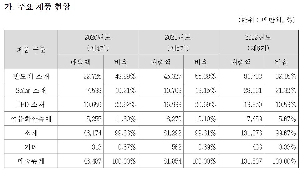 일본에서 수입해오던 반도체 전구체도 생산가능해 졌다. High-K(고유전 물질) 전구체는 디램 커패시터 및 트랜지스터 게이트의 절연막에 사용된다. 사업보고서에서 반도체 소재 관련 매출이 꾸준히 증가하는 모습을 볼 수 있다.