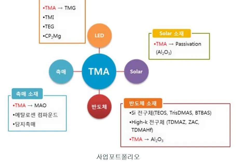 국내 독점 생산 가능한 TMA를 다양한 분야에 활용하였다. 원래 개발목적이었던 led 소재로 사용함은 물론 태양광에까지도 활용했다.  PERC(Passivated Emitter Rear Cell)는 태양전지의 뒷면 전극의 반사층을 만들어 발전효율을 향상시키는 기술이다. 고효율 솔라셀 수요가 증가함에 따라 PERC 공정에 들어가는 TMA 소재도 수요가 증가하고 있다. 중국과 국내 모두 수요가 있다. (ds투자증권 권태우님 보고 서 일부 인용)