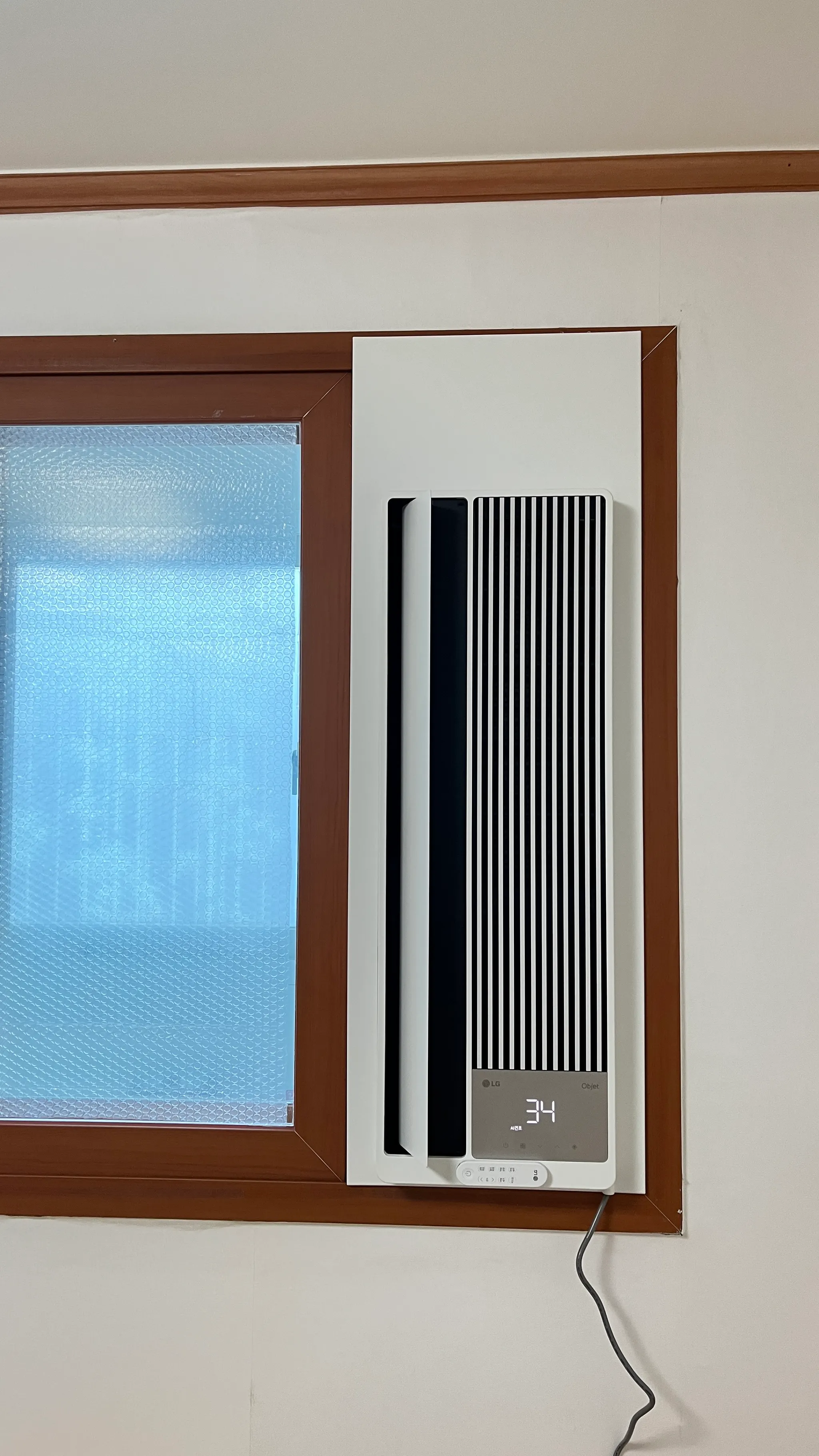예정대로 엘지 제품을 설치하기로 하였다. 기사님 두 분은 약속한 시간에 잘 오셨고, 20분도 안되는 짧은 시간 동안 이중창 키트까지 조립해주셨다. 마지막에 엘지 씽큐앱에 등록도 시켜주시고 간단히 에어컨 사용법을 알려주셨다.  설치해 놓고 보니 아주 이쁘다 ㅎㅎ 체리몰딩에도 살아남는 아름다운 디자인.