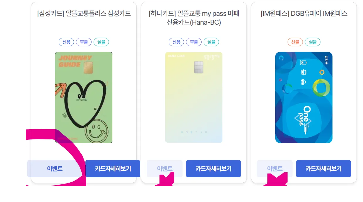 위 알뜰교통카드 이미지를 클릭하면 발급 가능한 카드 목록이 뜬다. 아래 그림을 자세히 보면 삼성카드와 같이 이벤트 버튼이 활성화된 카드들이 있다. 기왕 만드는거 이벤트를 하는 카드를 만들면 좋을 것 같다.