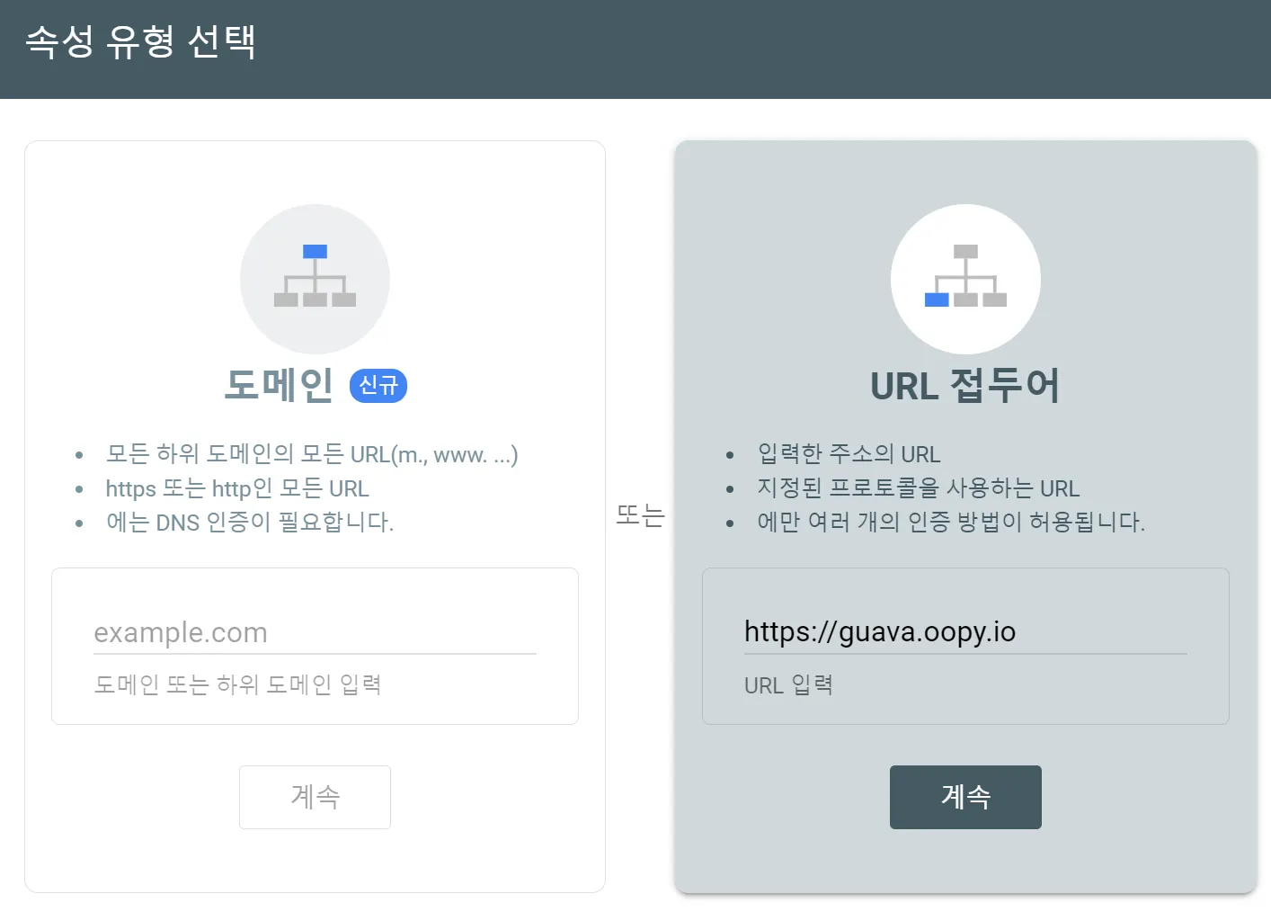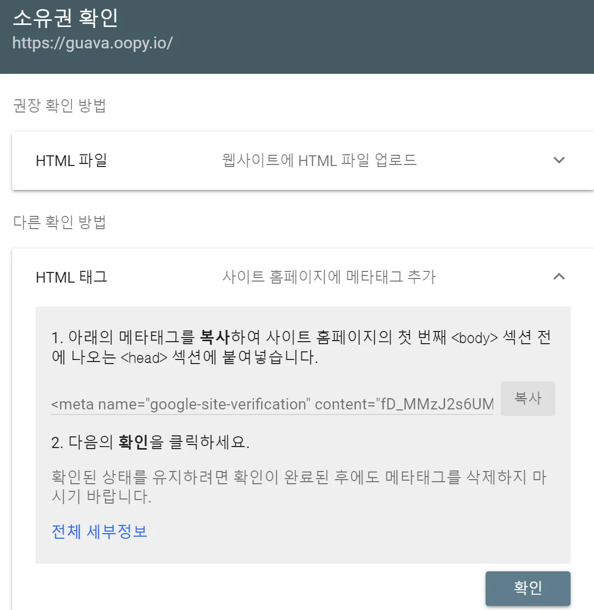 우피 주소는 ***.oopy.io 라는 주소로 만들어 진다.  구글 서치 콘솔에 등록할 때는 url 접두어 쪽을 골라 등록하면 된다.  그다음에는 사이트 소유권 인증을 하게 된다.