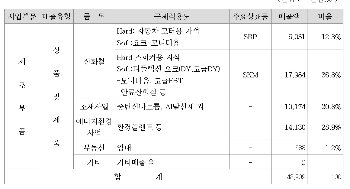 eg는 순도높은 산화철을 생산하는 업체다. 사업보고서를 같이 볼까? 산화철 매출의 절반이상은 페라이트를 만드는 업체에 보낸다. 페라이트는 쉽게 생각해서 산화철을 주재료로 하는 자성을 띄는 물체라고 생각하면 된다. 자동차부터 반도체까지 다양한 분야에 쓰인다.