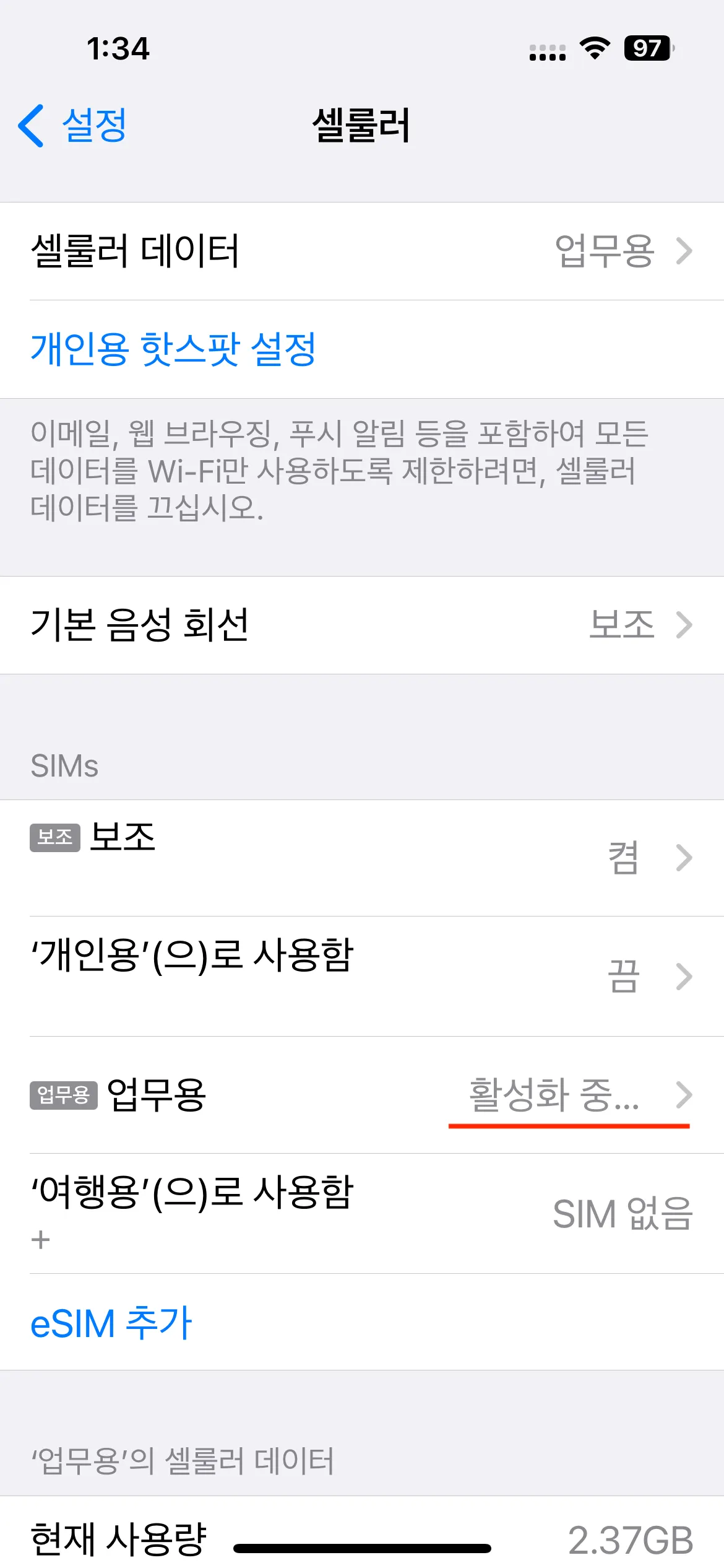 시키는 대로 계속 계속 버튼을 누르면 활성화중 하면서 멈추는데, 그게 정상이다. 활성화는 현지에서 가능하다. 현지 도착 후 데이터로밍을 사용으로 설정을 바꾼 후 사용하시면 된다.  활성화 중 하고 멈춘다면 셀룰러 설정에 들어가서 확인해보자. 위의 사진처럼 업무용으로 설정한 에어알로 이심이 활성화 중으로 뜬다면 제대로 설치가 된 것이 맞다.