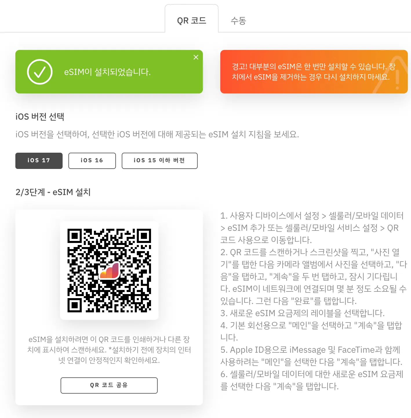 esim을 모든 단말기에서 지원하지는 않는다. 아이폰의 경우 XR이후 기종부터 지원하며, 갤럭시의 경우 갤럭시 23, 갤럭시 폴더 플립 4부터 지원한다고 한다. 가급적 한국에서 미리 설치를 하고가길 권하는게, 와이파이나 데이터가 없는 환경에서는 설치가 불가능하다.