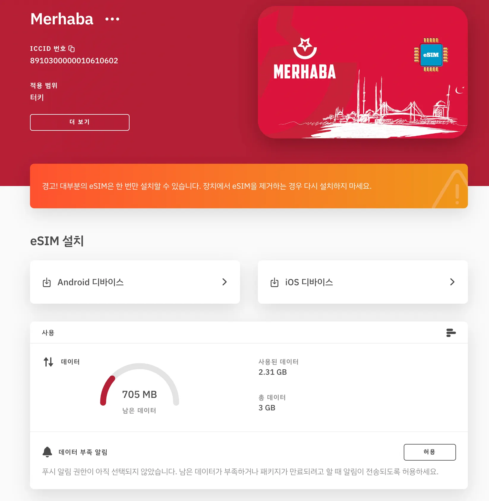 에어알로에서 튀르키예로 검색하면 나오지 않고 터키로 검색하면 나온다. 이심은 데이터 전용이기 때문에 전화, 문자는 되지 않는다. 현지 전화번호가 필요하신 분은 유심을 한국에서 구매해서 가시는 편이 좋을 것 이다. 나 같은 경우 일주일 여행이라 3GB 30일 플랜을 구매하였다. 급하게 잘 사용하였다. 카파도키아에서도 문제없이 연결이 잘 되었다. 이스탄불 지하철 탈때랑 카파도키아에서 벌룬 탈때 잠시 끊긴 것을 제외하고는 잘 사용이 되었다.