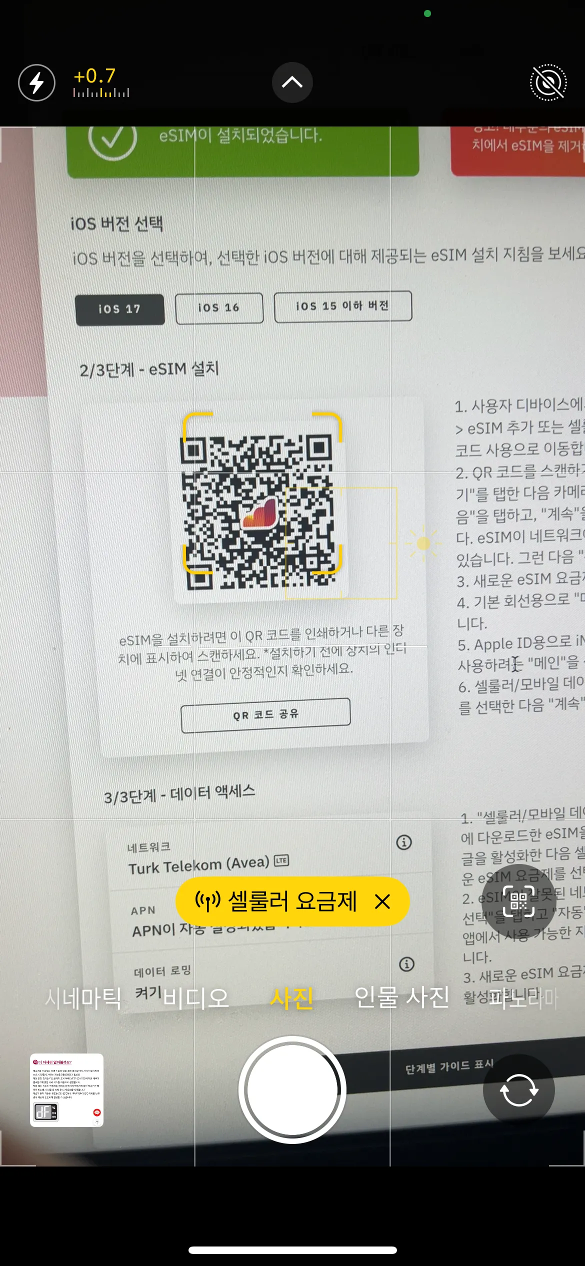 자신의 휴대폰에 해당하는 디바이스를 누르면, 설치 방법 안내와 설치 QR 코드가 뜬다. esim은 한번만 설치할 수 있기 때문에 주의하자. 에어알로 로고가 새겨진 큐알 코드를 핸드폰으로 스캔하면 다음과 같은 화면이 뜬다. 여기서 뜨는 셀룰러 요금제를 누르면 자동으로 설치가 시작된다.