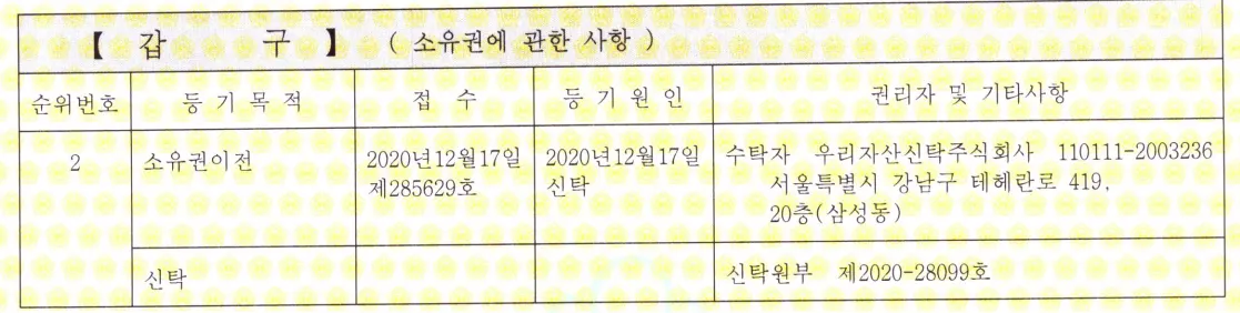 여기서 멈췄어야 했는데, 우리는 이미 계약금을 넣었기 때문에… 어쩔 수 없이 진행하는 방향으로 갔다. 인터넷을 보니 신탁이 등기에 기재된 경우 반드시 신탁원부를 확인해 보라고 했다. 등기소에 직접 가기 어려운 상황이라 어렵게 대행을 맡겨서 신탁원부를 구해보았다.