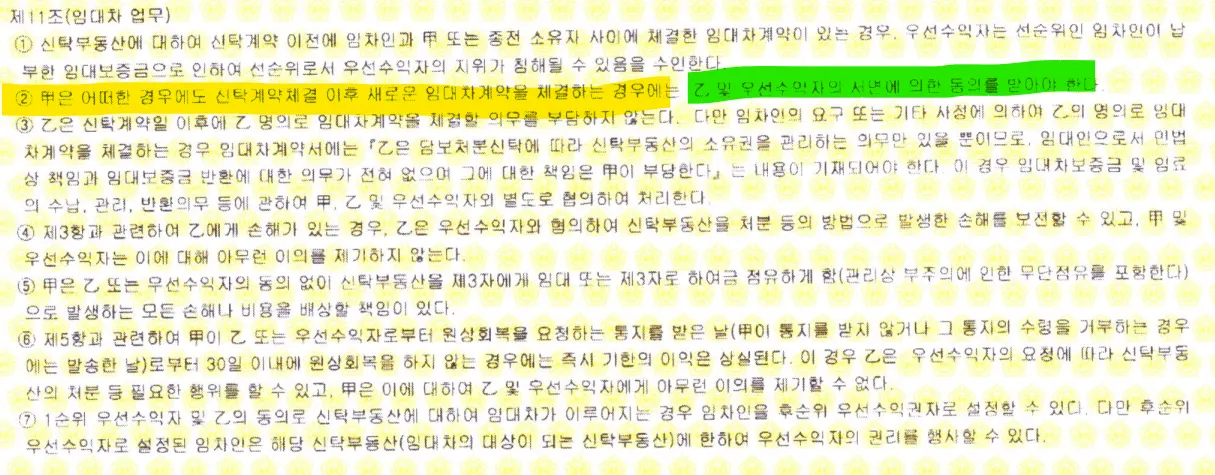 밑줄친 부분과 같이 임대차계약을 하려면 원래는 을인 우리자산신탁과 우선 수익자인 화곡 신용 협동조합의 서면 동의서가 필요하다.