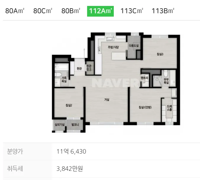 30평대는 현관 창고, 다용도실, 펜트리등 곳곳에 수납 공간이 숨어있다. 붙박이는 침실2에만 고를 수 있던데 침실 3도 하나 넣어줘야 이불도 넣고 할 듯 싶다. 자녀가 있는 집이라면 넉넉하게 84를 넣으면 좋겠지만 분양가가 만만치 않다. 분양가, 발코니 확장, 옵션, 중도금 이자, 취등록세 하면 정확하게 계산해보진 않았지만 12.5억은 충분히 넘을 것 같다.
