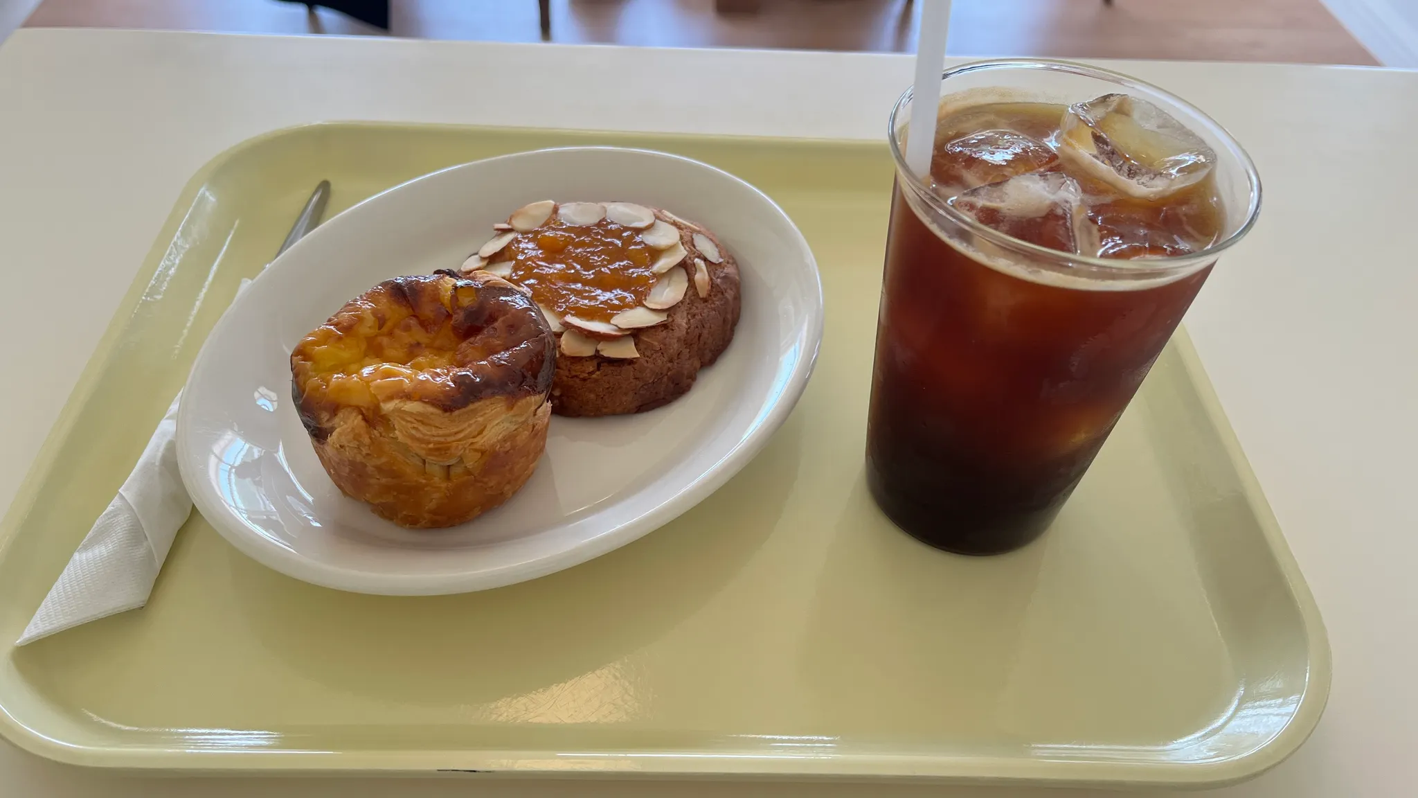 많은 메뉴를 시키고 싶었지만 혼자 왔으므로 욕심내지 않고 기본적인 메뉴만 시켜본다. 바닐라 크림 콜드브루 시키고 싶었지만 혹시 달까봐 시키지 않았다. 디저트에는 어쩔 수 없이 아이스 아메리카노다. 디저트는 블로그 추천메뉴인 에그타르트를 시켜본다. 케이크도 추천하던데 배가 불러서 살구잼 쿠키만 시켜보았다.