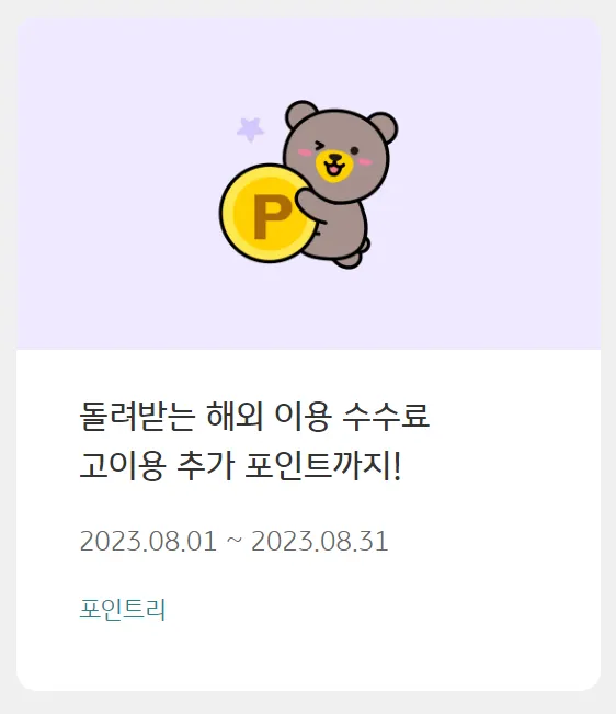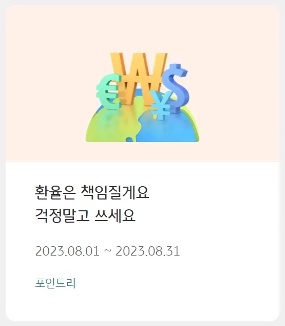 국민 카드 애용자지만 국민카든 이벤트도 무조건 참여버튼 눌러야 참여혜택을 받을 수 있다. 반드시 이 두가지 이벤트에 참여하여 수수료와 환율 우대를 챙겨보자.  첫번째 이벤트는 해외 이용 수수료를 포인트리로 캐시백 해준다.  두번째 이벤트는 해외 가맹점에서 40만원까지 이용시 환율을 1000원으로 적용하여 포인트리로 캐시백 해준다.